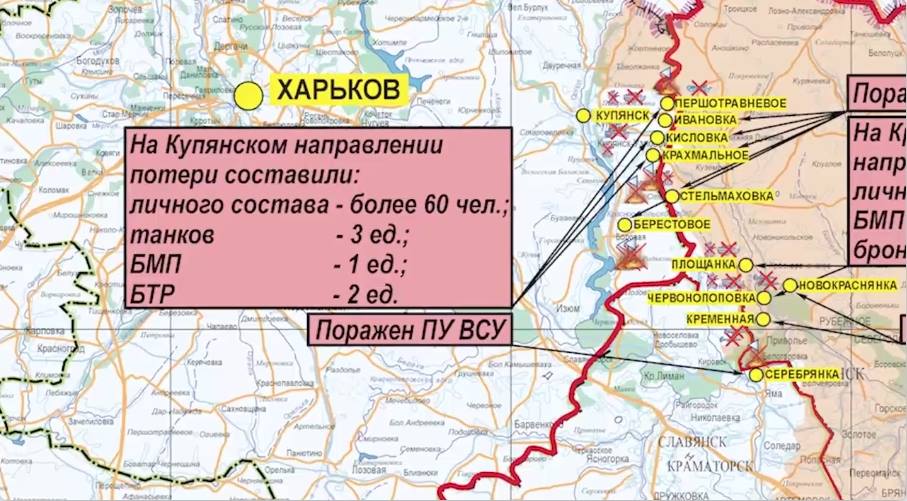 В направлении Купянска украинская армия активных действий не предпринимала. Населенные пункты Табаевка, Кисловка, Берестово в Харьковской области и Новоселовское в ЛНР были поражены сосредоточенным огнем противника и мощными огнеметными системами.